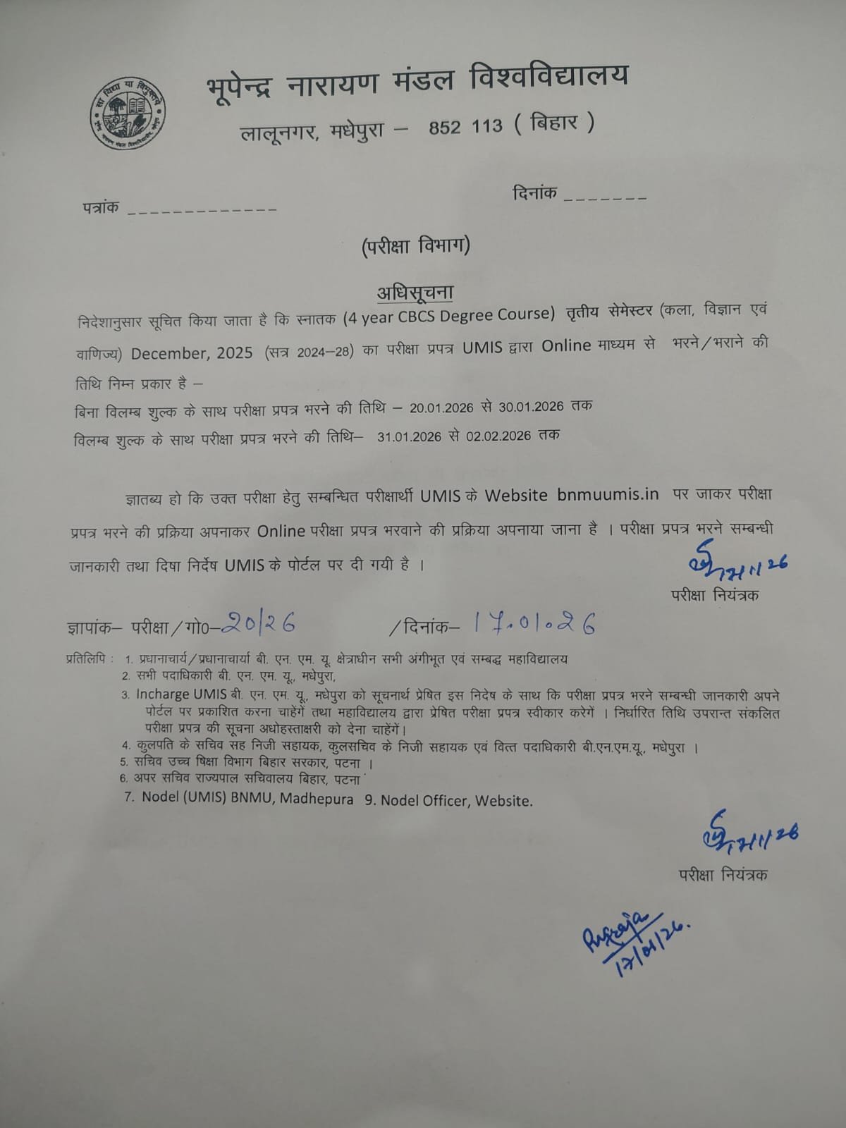 विश्वविद्यालय के द्वारा जारी नोटिस के अनुसार अभ्यर्थी अपना परीक्षा फॉर्म 20 जनवरी 2026 से 30 जनवरी 2026 तक बिना विलंब शुल्क के साथ भरेंगे वही विलंब शुल्क के साथ 31 जनवरी 2026 से 02 फरवरी 2026 तक भरे जाएंगे इसलिए अभ्यर्थी को सूचित किया जाता है कि वह अपना परीक्षा फर्म समय केअंदर भर ले। (BNMU के द्वारा संचालित स्नातक पाठ्यक्रमों को नई शिक्षा नीति (NEF) के द्वारा 4 वर्षीय CBCS pattern पर लागू किया गया है।)